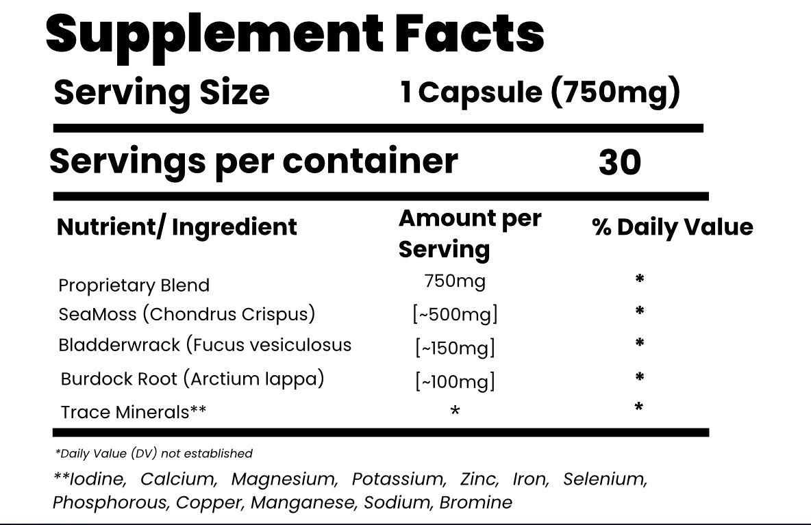 Nourish your body from the inside out with our thoughtfully crafted capsules, a harmonious blend of nature’s most potent botanicals. Infused with wildcrafted sea moss, nutrient-rich bladderwrack, and detoxifying burdock root, this formula supports holistic wellness, promoting vitality, energy, and balance.