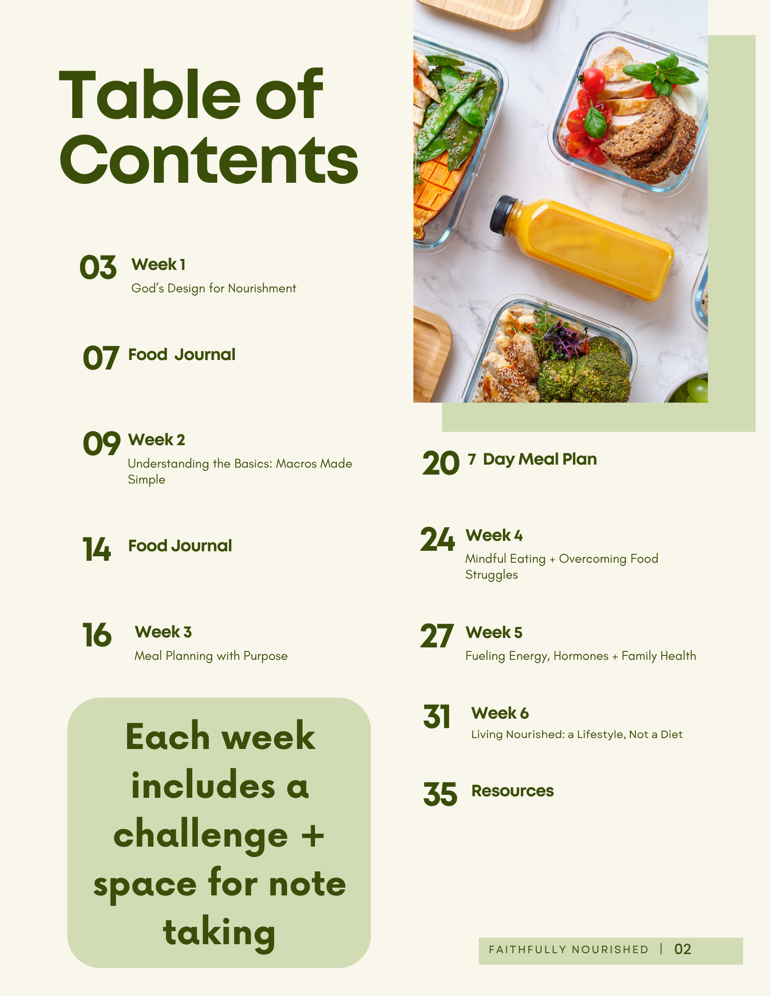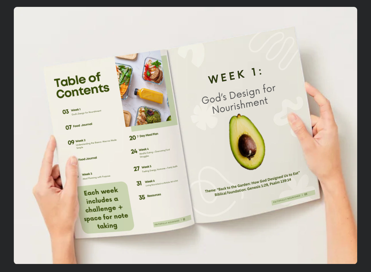 The Faithfully Nourished Workbook is your companion for rebuilding your relationship with food, fitness, and wellness through a biblical lens. Created for women who want to care for their bodies without guilt, shame, or obsession, this 36-page guide walks you through a faith-fueled reset: one that honors both your hormones and your heart.
